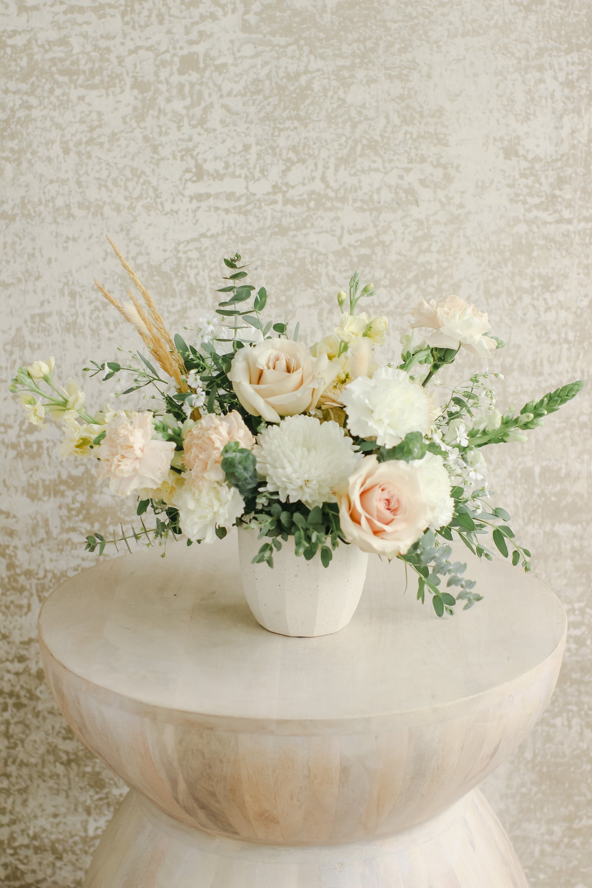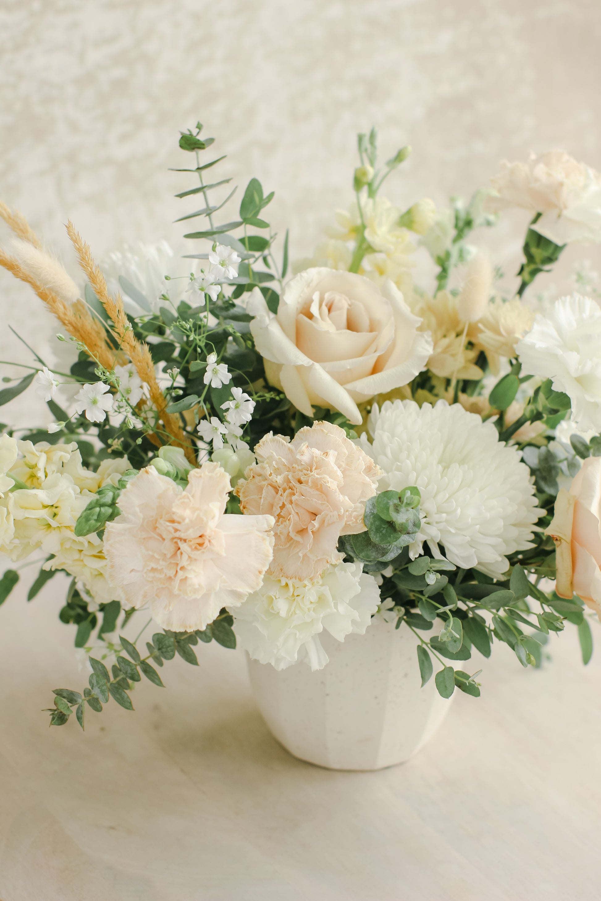 A delicate, boho arrangement including soft petalled blooms and textural elements. Designed in a ceramic stone vase. Whimsical & dreamy - perfect for any occasion.