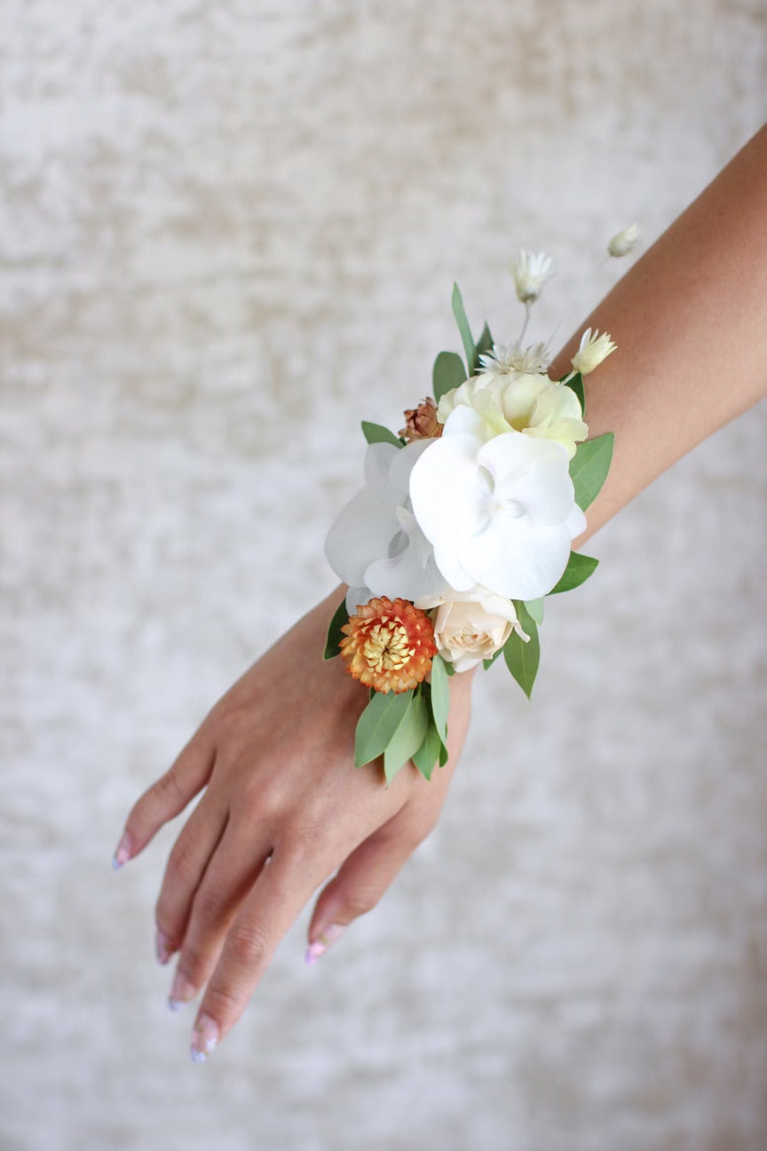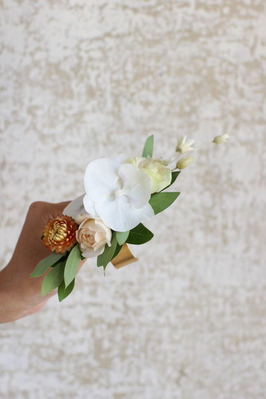 Enhance your special occasion with our unique and artisan made Cuff Wrist Corsage. Its jewelry-like design adds a touch of elegance, making it the perfect accessory for any special occasion. Handcrafted with care on an adjustable gold metallic bracelet, this one-of-a-kind accessory is a must-have addition to your occasion.