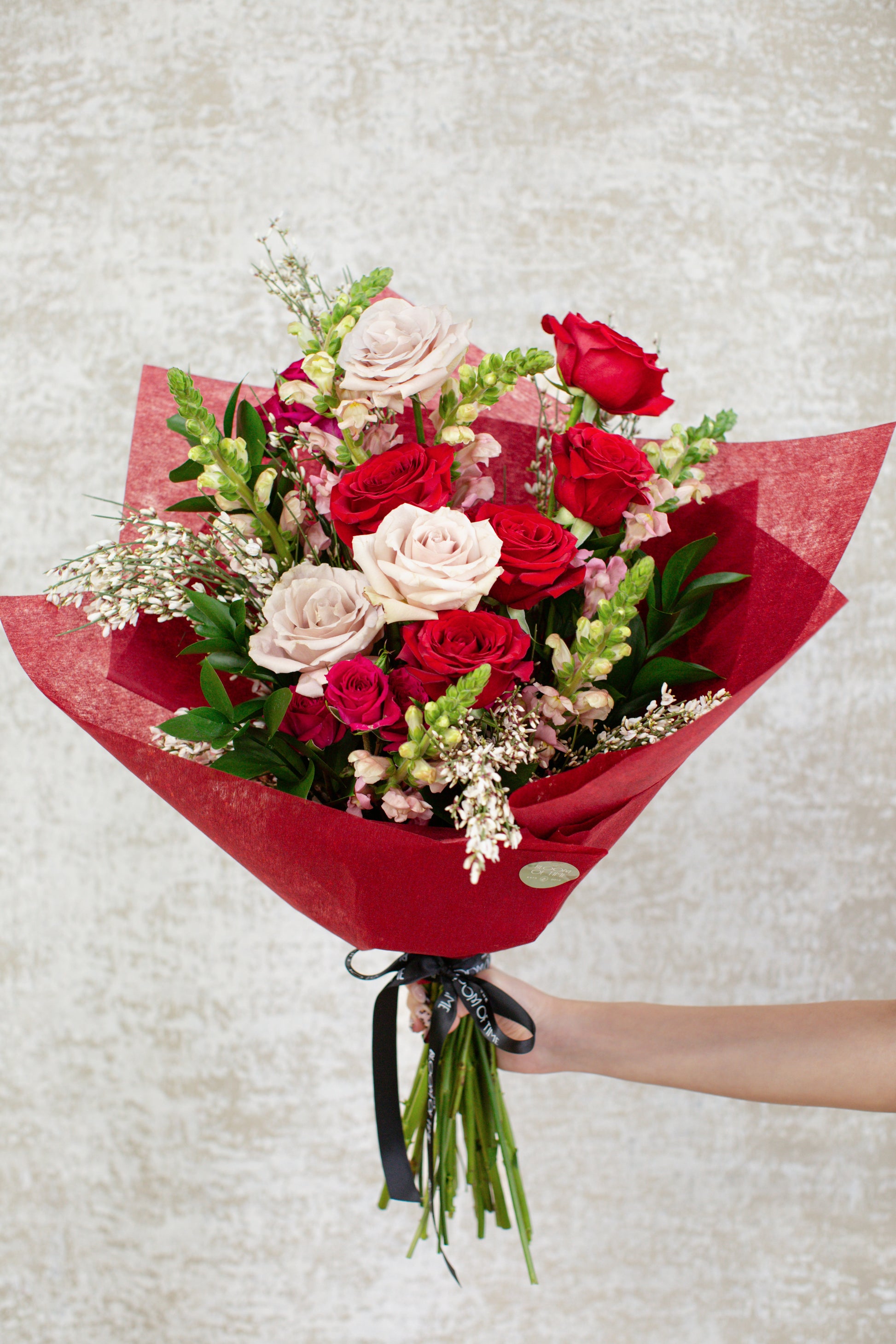 A whimsical, romantic rose bouquet designed to make Valentine’s Day feel extra special. The Grand Romance bouquet features a lush mix of classic red and soft blush roses, wrapped in romantic red paper for a timeless and heartfelt presentation.