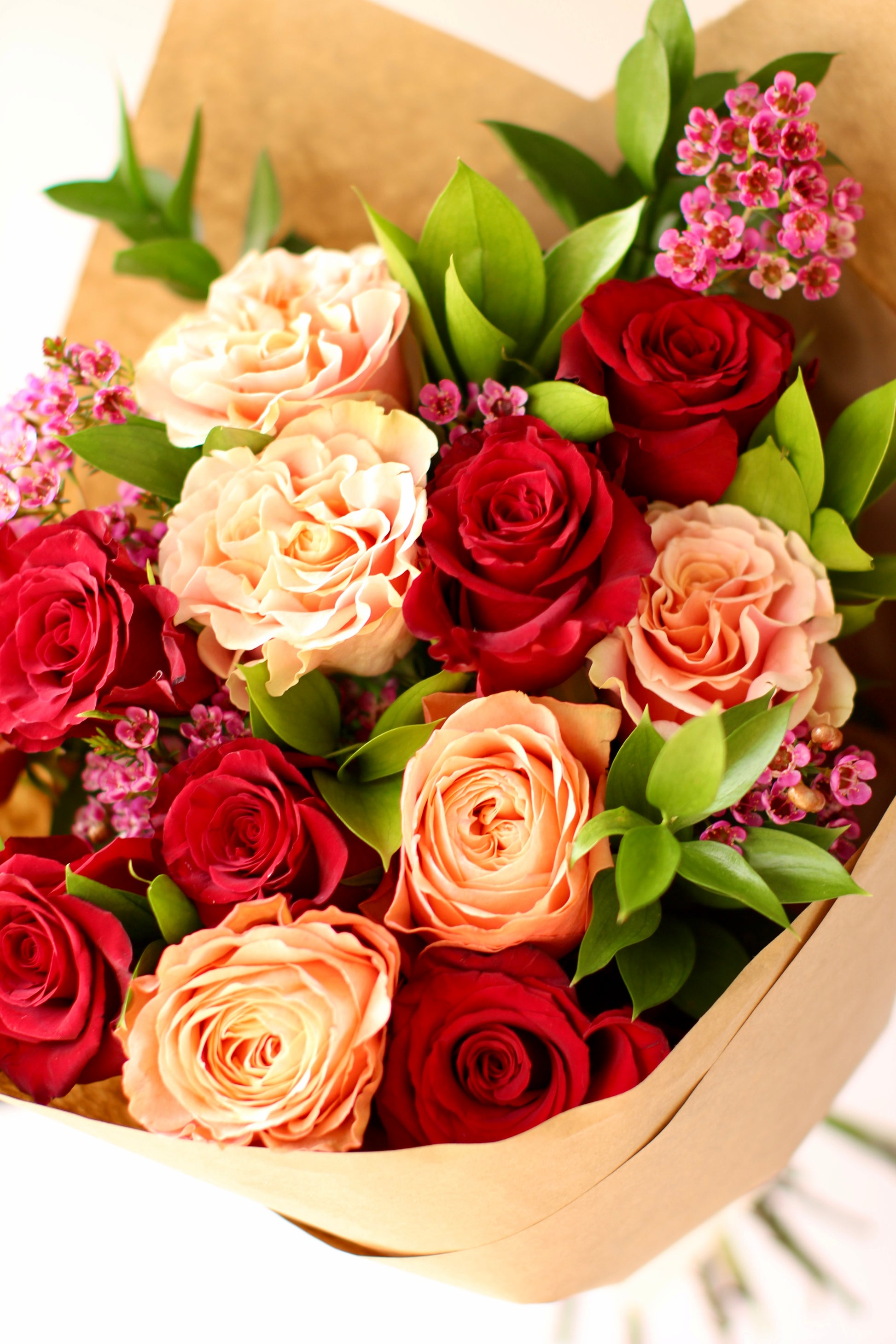 A lovely hand-wrapped bouquet that's sure to warm the heart of someone special. Featuring a variety of premium peach toned roses amongst vivid red roses, framed with lush and glossy foliage.