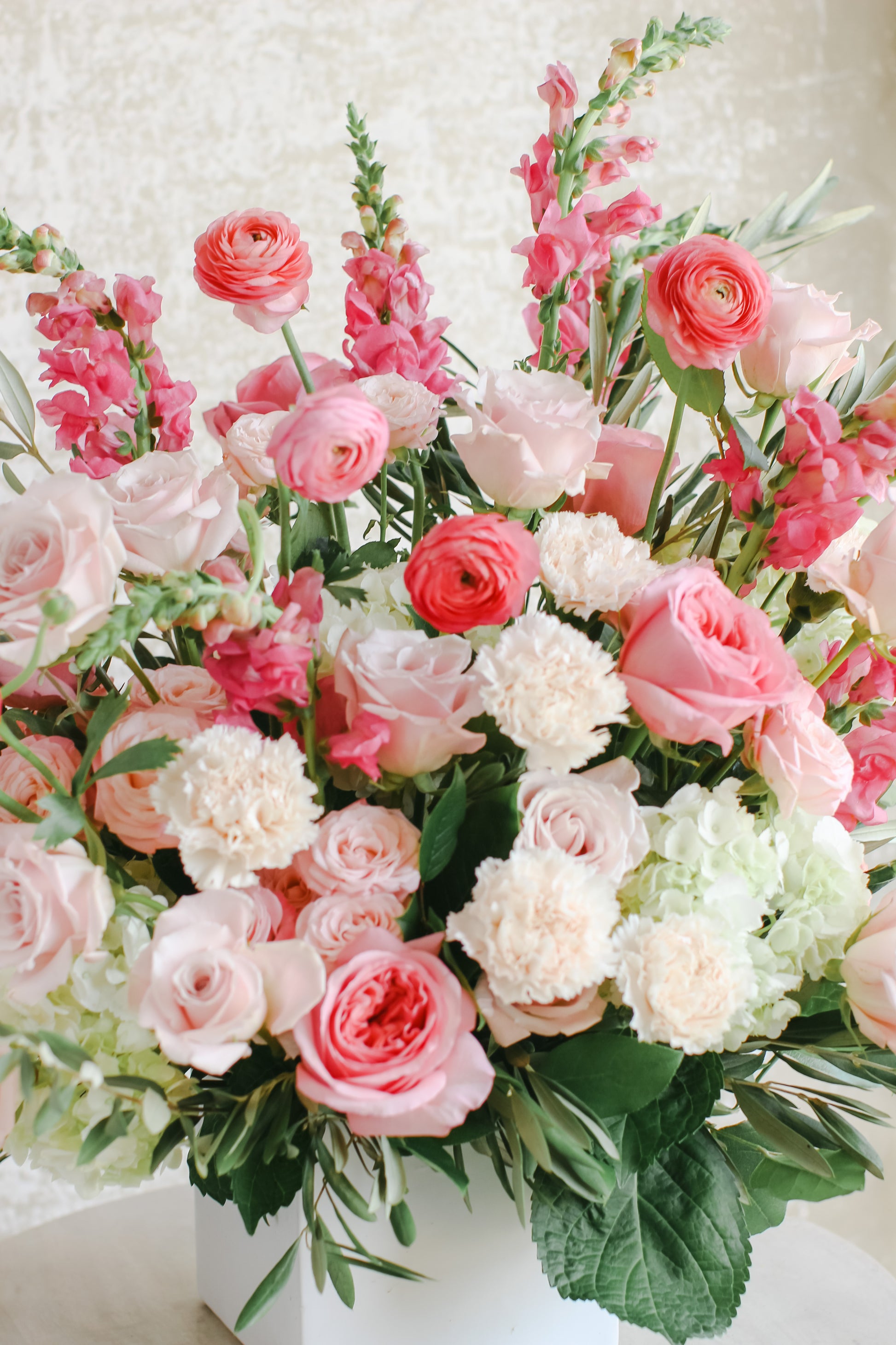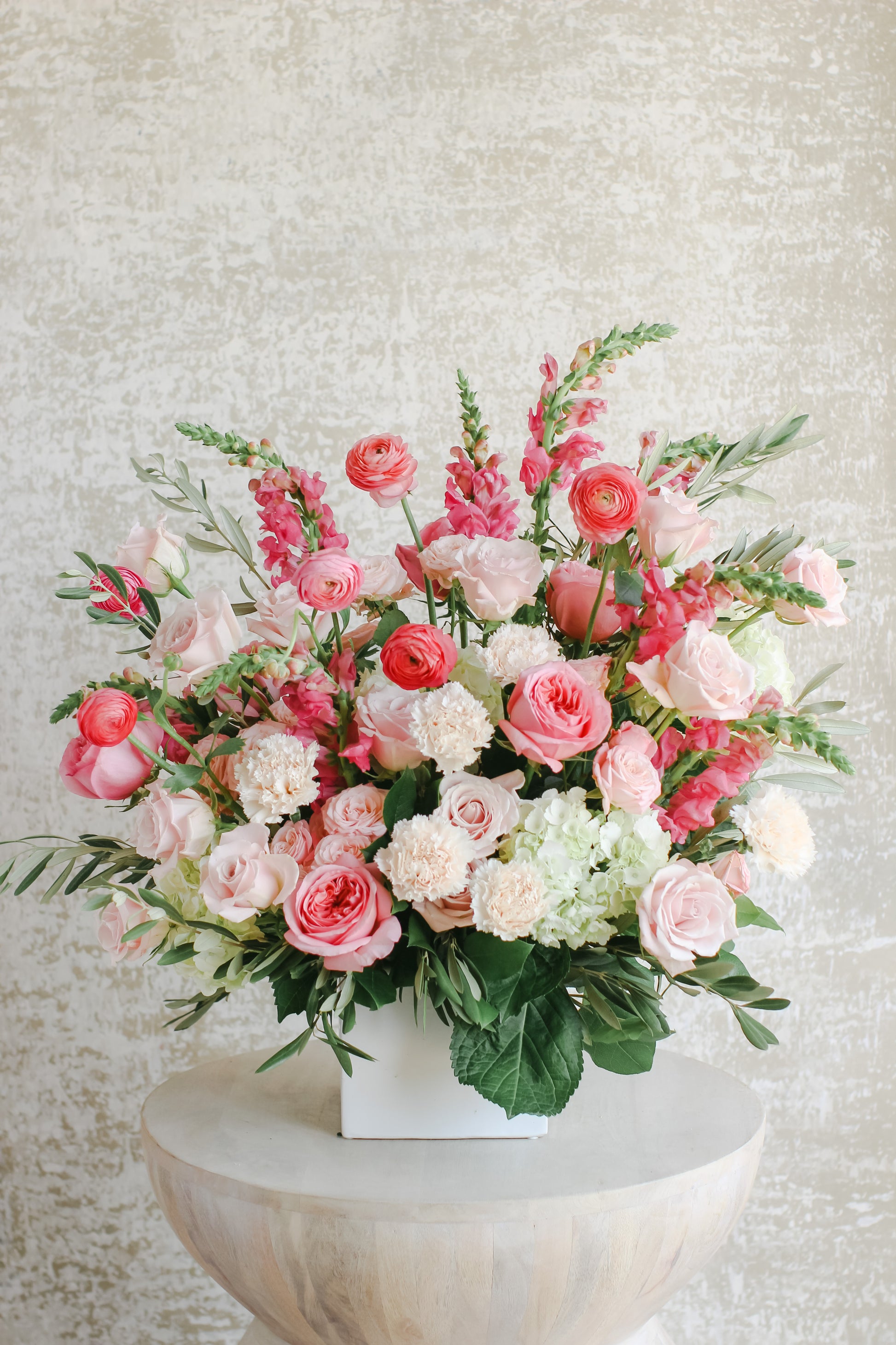 A modern sweeping design of pink and white blooms and foliage arranged in a clean white vase. Perfect to celebrate a big occasion, to give the person who just loves pink, or as a splashy accent for the home!