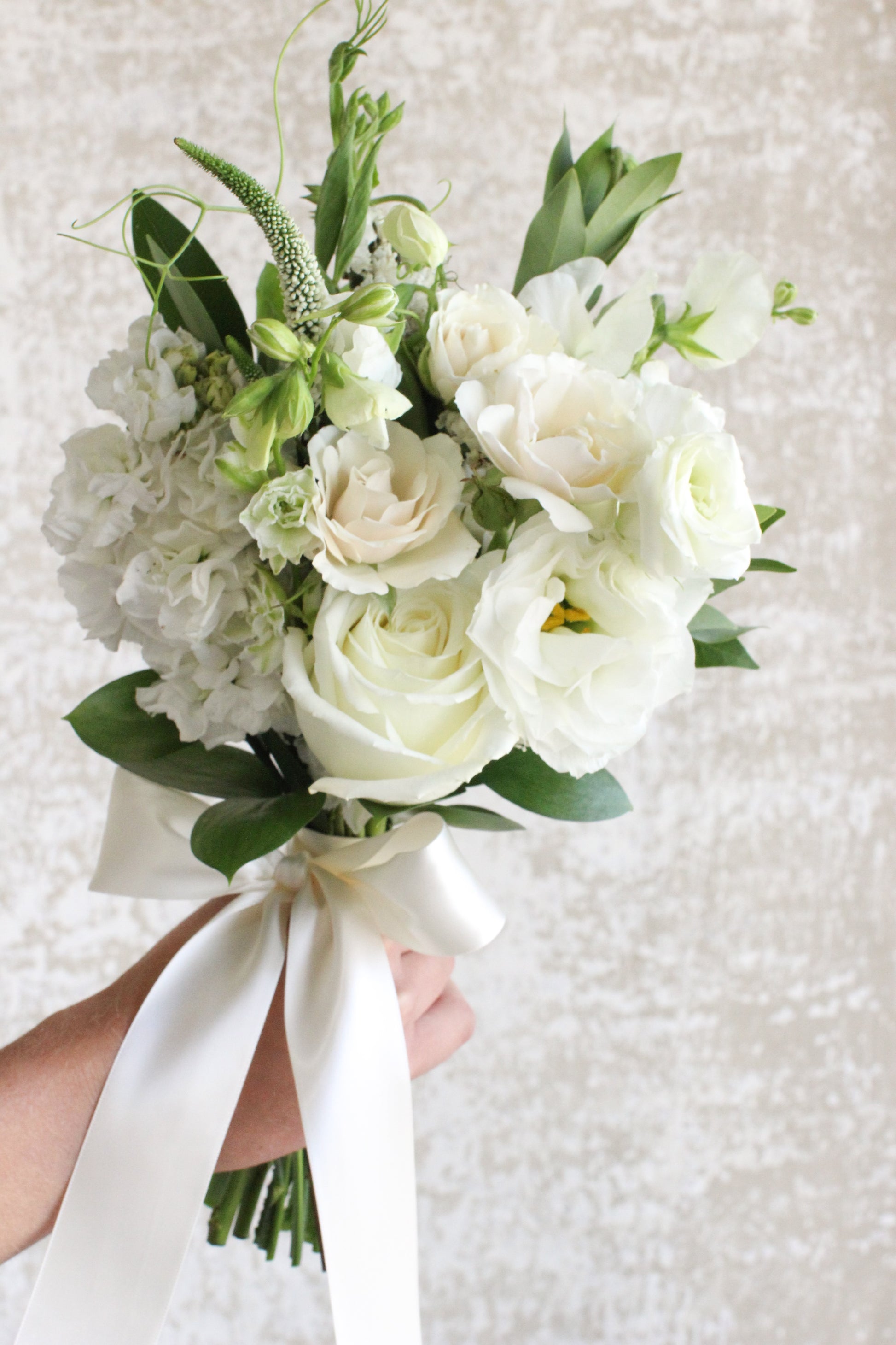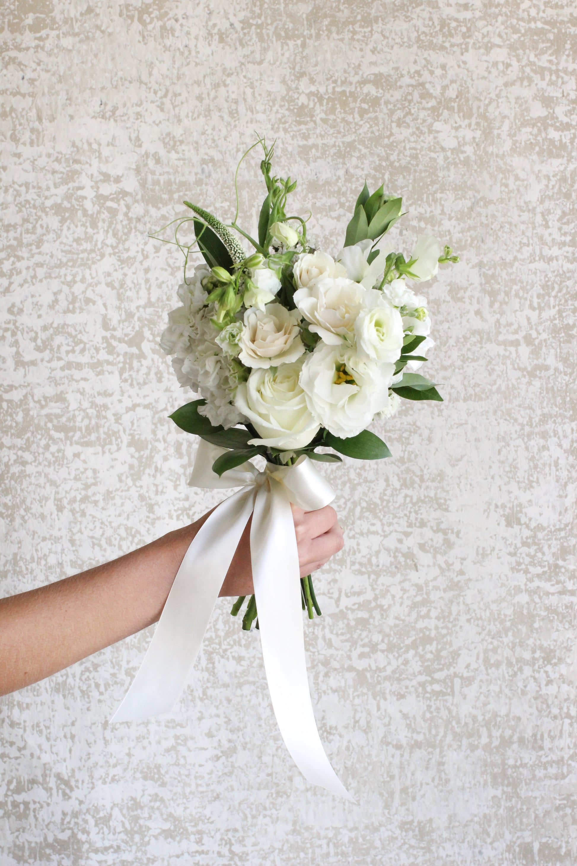 A sweet posy bouquet, arranged with premium and seasonal blooms customized just for you, wrapped in satin ribbon! Shown here in white, but you may request the addition of other colors in the order notes if desired. This bouquet is a petite, hand-held size, perfect for bridesmaids, homecomings, proms, and formals.