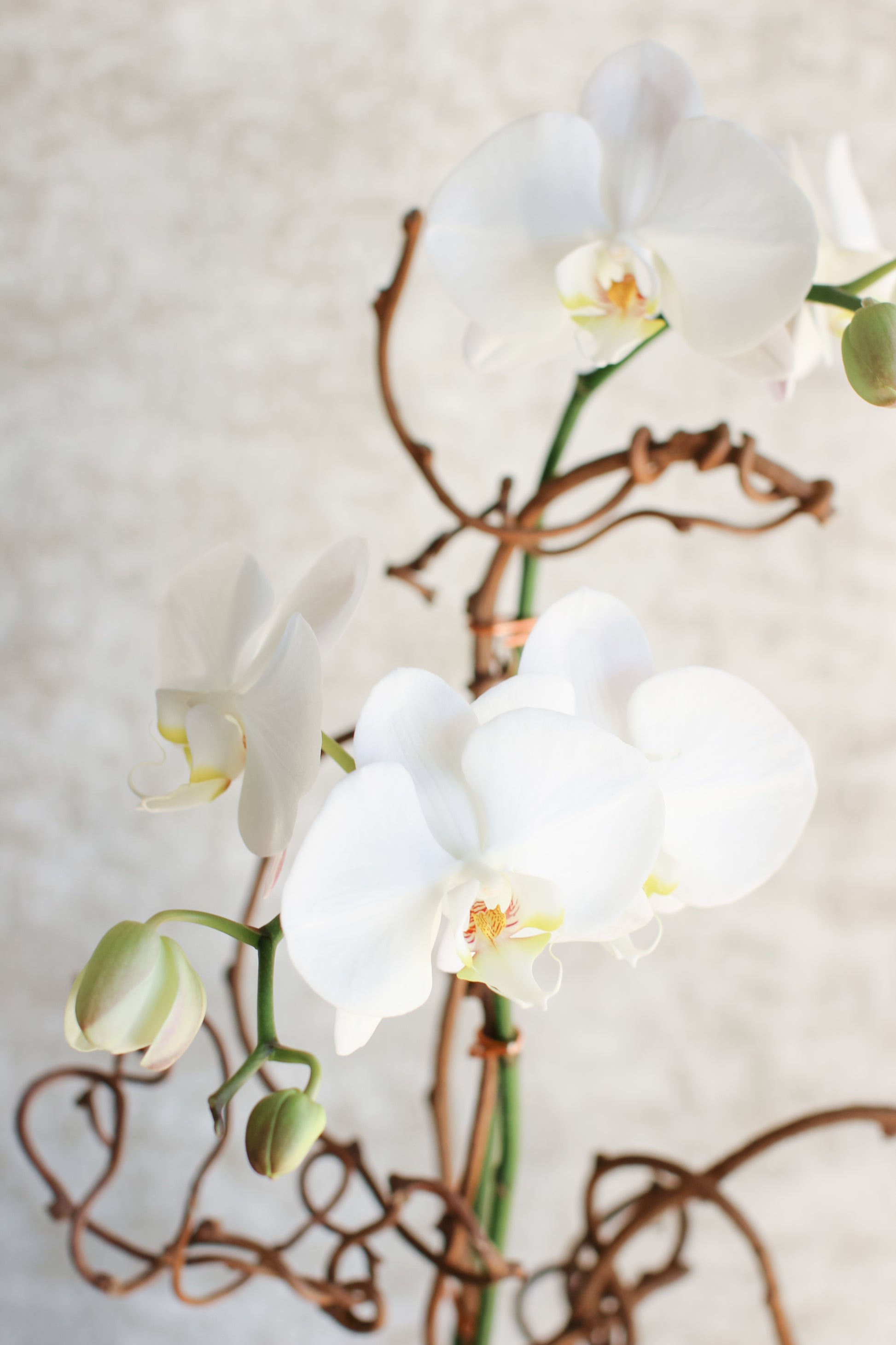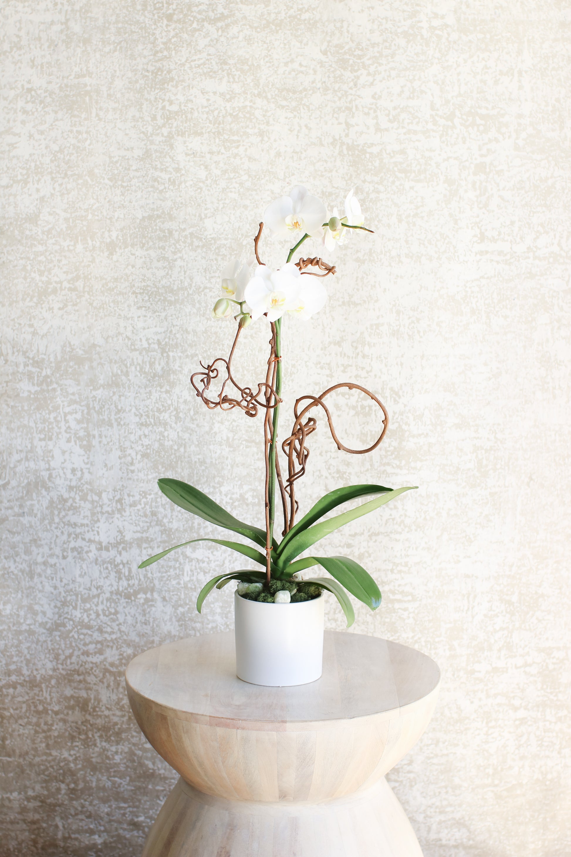 A single living cascading phalaenopsis orchid is carefully planted with moss and kiwi vines in a matte ceramic pot. A striking gift or addition to the home or office. Also available with a colorful orchid.
